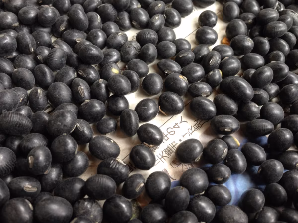 5月中下旬に畑にタネ(ダイズ)をまき、秋彼岸頃に収穫をする黒五葉という品種になります。