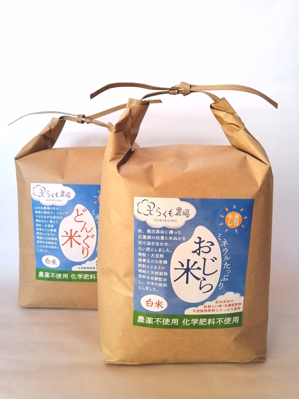 ▼商品概要  山の水農場のきのこ栽培で使われるどんぐりがなる木が主成分の廃菌床を堆肥とし栽培したどんぐり米と、おじろ渓谷の枯葉を集め、米糠とミネラル資材と 一緒に田に撒き混ぜ発酵させ堆肥としたおじら米をセットでお届け致します。 魚粉、大豆粕、海藻などの良質有機肥料とミネラル補給のため、天然鉱物肥料を自家配合してお米の肥料としました。 できるだけ自然乾燥を行うためにハゼ掛け天日干しをしています。 お米は、過乾燥だと食味を悪くしてしまい、乾燥が足りないとカビやすくなります。 お米の含有水分量を15%前後に微調整するために天日乾燥した後に再度機械乾燥をして品質保持を行っています。また玄米を冷温保存して食味の低下をやわらげ、年間を通して美味しいお米を提供しています。 ▼品種・味の特徴 コシヒカリ・粒感のある食感で適度な粘り、適度な甘味を感じます ▼栽培/生産方法、こだわり 栽培期間中 農薬不使用使用・化学肥料不使用 稲をハゼ掛け天日干し ▼注文に際しての注意点(配送方法や納期指定など)