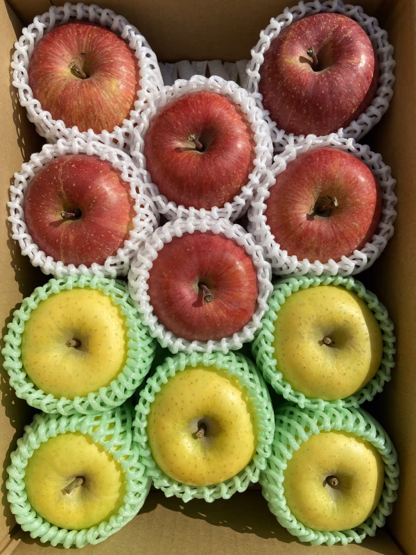 小沢農園の、シャキシャキりんご🍎完熟サンふじと、パリッとさわやかりんご🍏シナノゴールドの詰合せです‼️
