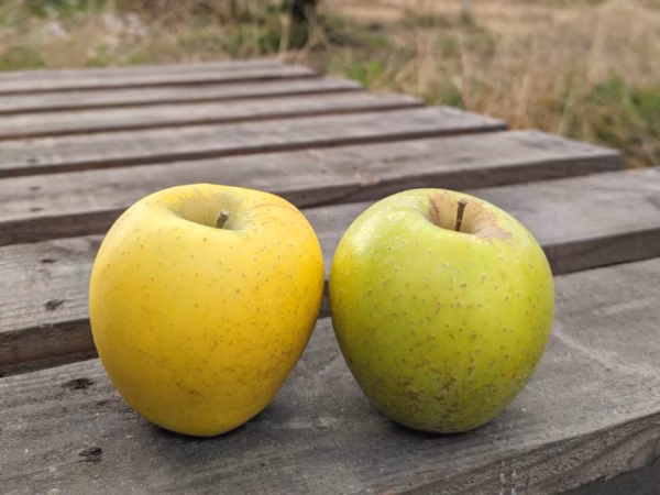 〈シナノゴールド〉の黄色、〈王林〉の黄緑色