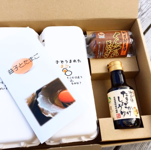 朝採り卵と、たまごかけご飯用の醤油、そして燻製卵をセットにしました。贈り物にできるように化粧箱に入れさせて頂きました。