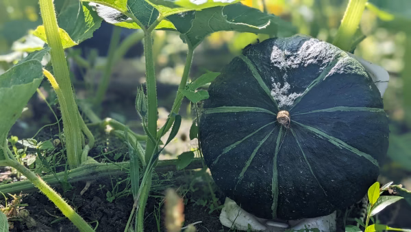 1本のツルから2個だけを取る栽培方法です。かぼちゃに味を集中させるため、3個目のカボチャから全て落とします。