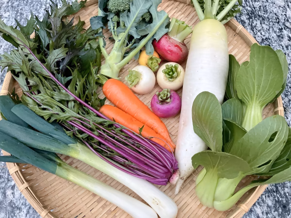 大根・赤大根・紅かぶ・白かぶ・人参・水菜・ミニチンゲン菜・ブロッコリー・カリフローレ・ねぎ・春菊・さつまいも
