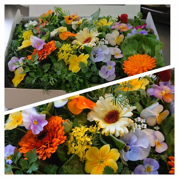 このハーブサラダフラワーボックスには、多数のハーブ、野菜、エディブルフラワーが入っており、お皿に広げるだけでレストラン顔負けの素敵な素敵なサラダになります✨