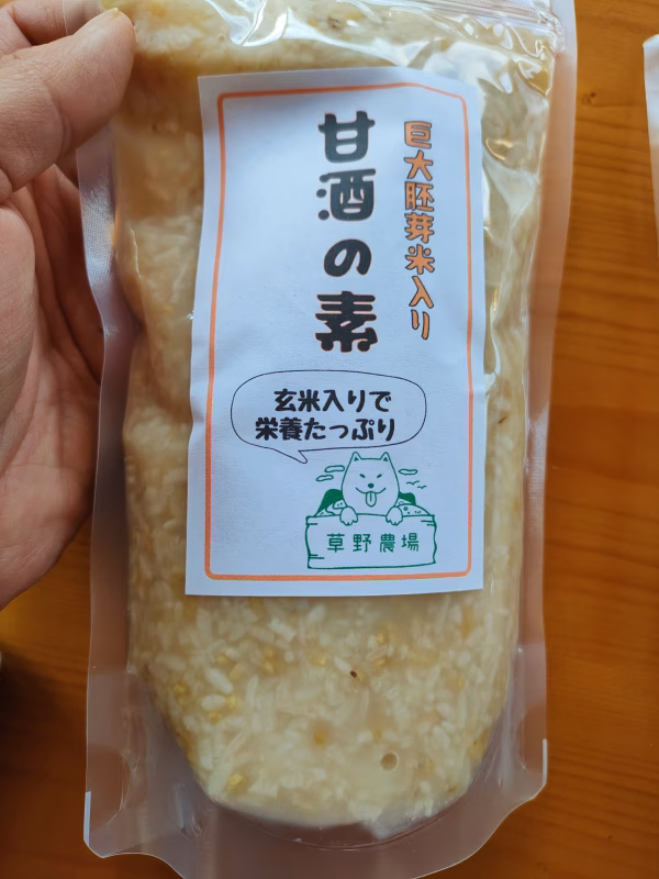 巨大胚芽米入りの甘酒の素オンリーです。 お好きな個数からご注文ください! ▼巨大胚芽米入り甘酒の素 うるち米の代わりに草野農場の「玄米食米」を使ってつくりました。五色米入りに比べて玄米の量が圧倒的に多く、よりプチプチ食感が楽しめます。手軽に玄米を食べてみたい方にもおすすめです。こちらも味はプレーンと大きな違いはありませんが、五色米入り以上に玄米のプチプチ食感を感じられます。 ▼コップ何杯分? 以下で紹介している2.5倍に薄める飲み方でコップ4~5杯分の甘酒が作れます。賞味期限はご注文からおおよそ1か月程度ですので、飲みきれる量でご注文ください。賞味期限までに飲みきれないと思う場合は、冷凍して頂くより長く保管して頂けます。 ▼吹き出し内のセリフについて 吹き出し内のセリフは基本的にランダムで発送しますが、贈り物などにご利用の場合はお好きな言葉を無料で入れさせて頂きます。できる限り10袋単位でのご注文がありがたいので、まずはご相談ください。 ▼甘酒の作り方(2.5倍に薄める) 甘酒の素80㏄と水120㏄を鍋に入れ、沸騰するまで加熱します。沸騰したら米粒が浮いてくるので、火を止めて塩を一つまみ入れ、かるく混ぜたら完成です。お好みですりおろしたショウガを入れてください。一度沸騰させることで米粒の中から美味しさが染み出てくるので、ただ薄めるよりグッと美味しくなります。オススメは2.5倍希釈ですが、お好みの濃さに調整してください。 ▼ミルク甘酒の作り方 甘酒の素60㏄と水60㏄を鍋に入れ沸騰するまで加熱します。沸騰したら牛乳(豆乳)60㏄と塩一つまみを入れ軽く煮立ってきたら完成です。草野農場のオススメは甘酒の素、水、牛乳を1:1:1の割合にすることですが、こちらもお好みの濃さを見つけてみてください。 ▼甘酒きなこヨーグルト プレーンヨーグルトにきなこをかけて、その上から甘酒の素をかけたらできあがりです。きなこと甘酒の素のバランスはお好みですが、きなこたっぷり、甘酒の素もたっぷりかけた方が美味しいです。 ▼甘酒シャーベット 適当な容器に甘酒の素をそののまま入れ、冷凍させたらできあがり。糖分が多いため氷のような硬さにならずシャーベットのような食感になります。レモン汁をかけるとより美味しなります。 ▼原材料について 米糀、滋賀県産うるち米、滋賀県産もち米です。 うるち米、もち米、米糀の原料になっているお米は草野農場が栽培したものを使用しています。栽培方法に関しては、おからと豆乳を肥料に使用し、除草剤や化学肥料等は使用せず栽培しています。 ▼米糀について 長浜市で大正時代から続く老舗の糀屋さん『小川糀』さんにお米を持ち込み、糀に加工をして頂いています。 ▼ロゴマークについて 商品表ラベル下部の犬のイラストは草野農場のロゴマーク、通称「ハナちゃんマーク」です。草野農場が飼っていた犬の「ハナちゃん」をモデルに広島県尾道市の石川愛奈さんにデザインして頂きました。自然や経済に翻弄されがちな農業ですが、素直に、泰然自若に農と向き合っていきたいという思いを込めています。 ▼セットでの販売について 既存の商品ページにない商品の組み合わせも対応しますので一度ご相談ください。例:甘酒の素1袋と五色米2袋と大豆1㎏が欲しい等