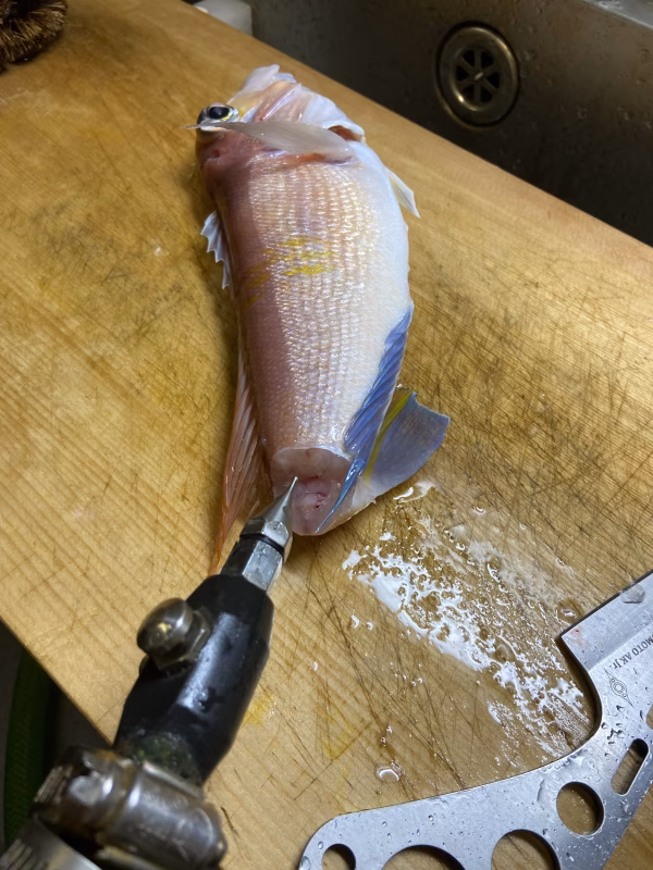 一本釣りで釣り立てをその場で脳締め、エラ切り、血抜き、水氷保存