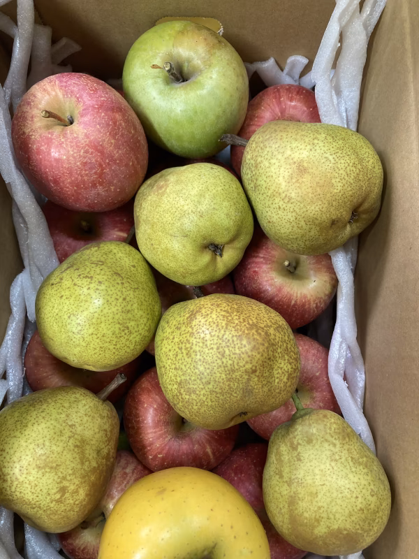 ラフランス約3キロ位、りんご約2キロ位です。合わせて5キロ超えるようにラフランスで調整します♪