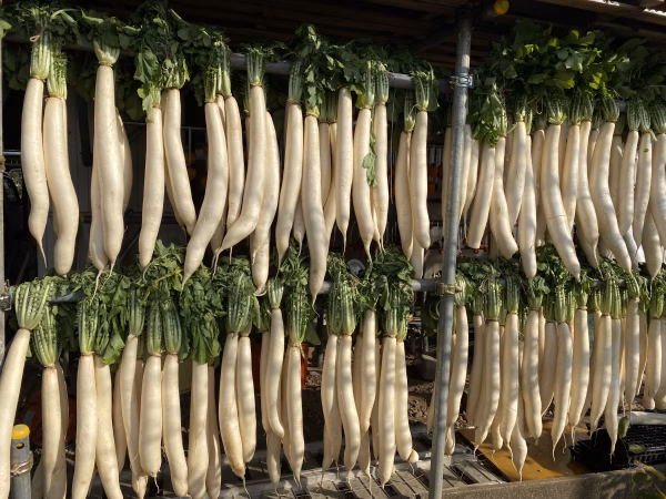 細くて長い練馬沢庵大根を関東の木枯らしの下で10日間ほど天日干しいたしました。