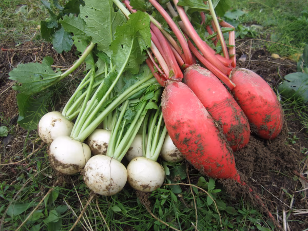 籾殻、米糠等で自家製ぼかし堆肥を作成し、雑草対策として籾殻を用い、葉には農薬を使用せず、くんたんで防虫剤の代用をしました。かぶ大根類は寒くなってからの収穫になるので、小規模であれば自然栽培も可能ではないかと思い栽培しました。見た目は少し悪いかもしれませんが、野菜本来の味が楽しめるかと思います。