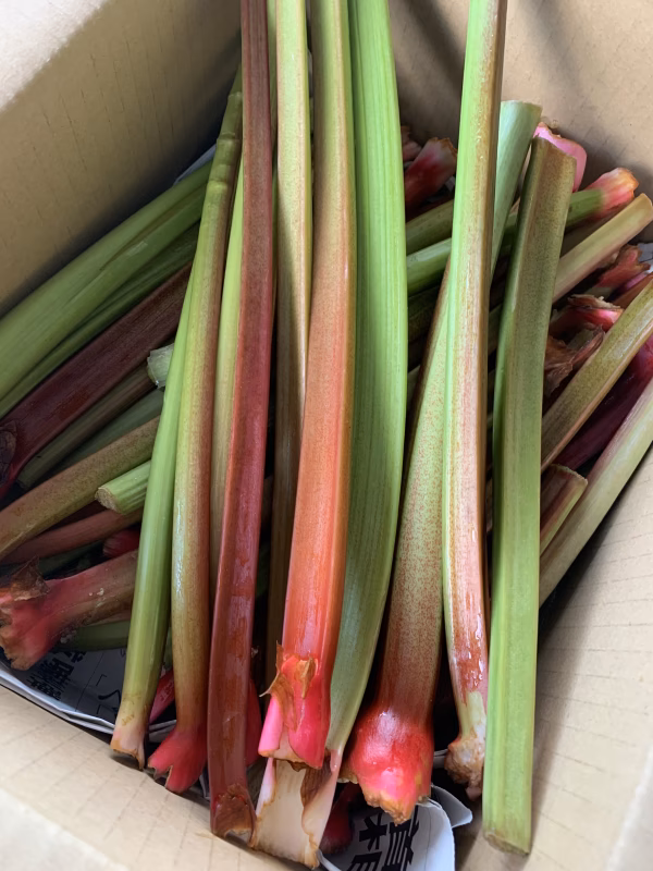少し赤みのある緑ルバーブを、箱に詰めてお届けいたします。