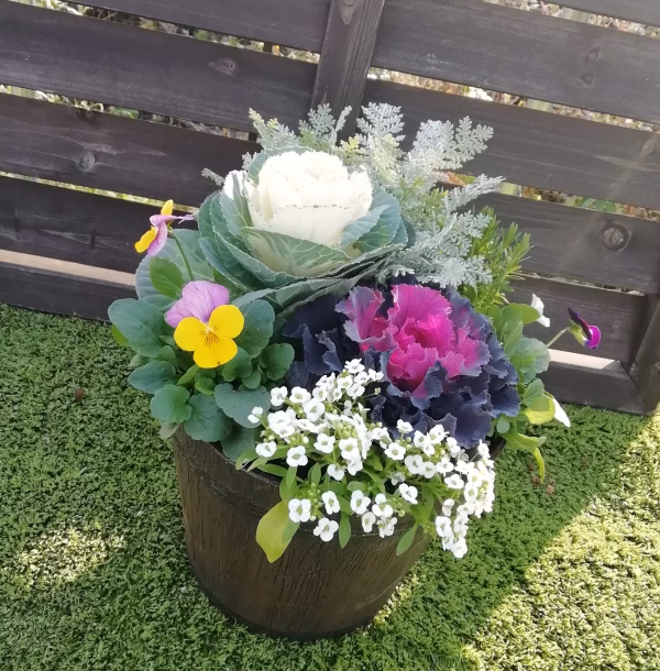 木製風の樽片型鉢の寄せ鉢です。プラスチック性ですが見た目は木製に見えるとても軽くて丈夫な鉢に季節のお花を寄せ植えしました。