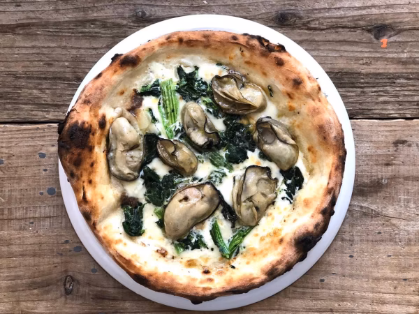 クリームソースをベースにしてアンチョビ、バジル、モッツァレラチーズ使った香り豊かなピザに、中川水産のぷりぷり牡蠣がトッピングされています。