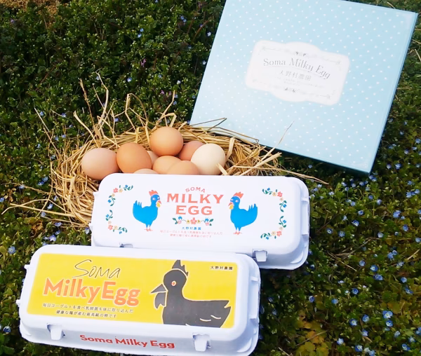 相馬ミルキーエッグは市販の配合飼料は一切使わず、相馬の米、魚屋さんから週3回直接いただく魚のアラ、自分の畑でとれた芋や豆など、鶏たちが食べるものはすべて自分の手の届く範囲で自給されています。また、飲み水には自家製のヨーグルトや納豆菌も混ぜており、体にいい発酵食品をたっぷり体に取り込んでいます。