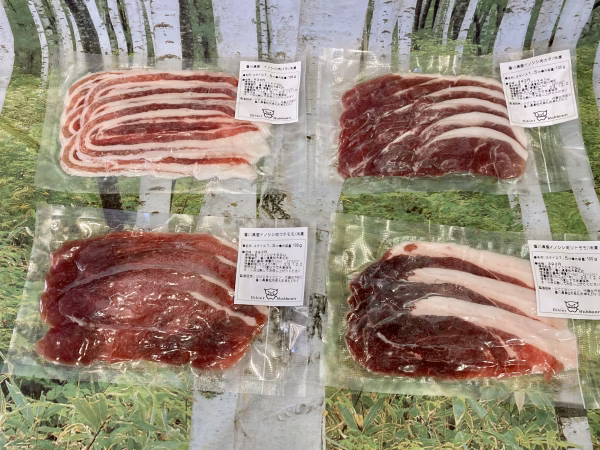 ジビエはメスの猪で、脂身が甘く美味しいバラ肉とソトモモ肉、赤身で味の濃いカタ肉、ウチモモ肉と、特長のある部位4種類をセットにしました。