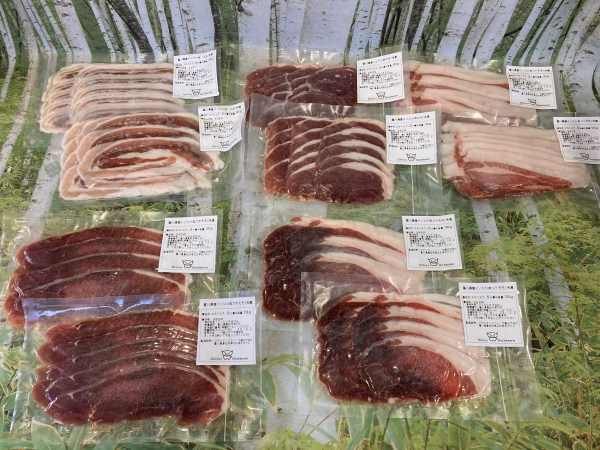 ジビエはメスの猪で、脂身が甘く美味しいバラ肉とソトモモ肉、赤身で味の濃いカタ肉、ウチモモ肉と、特長のある部位4種類をセットにしました。