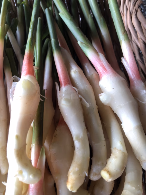 間引き生姜なので収穫量は少ないですが、丸齧りで美味しく食べられるほど非常に柔らかいので、カットせずにそのままの形での酢漬けは食べやすくて見た目もいいです。焼いたお肉を巻きつけたりなんてお洒落な食べ方もお勧めです!
