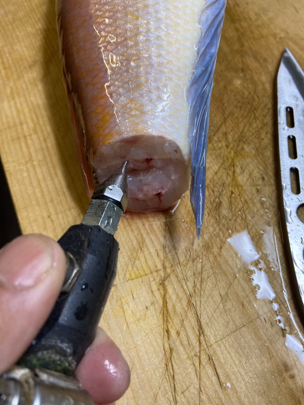釣りたてのアマダイを、その場で脳締、エラ切り、血抜きを行い、直ぐに水氷で冷やして自宅に持ち帰り津本式究極の血抜きを施してます。