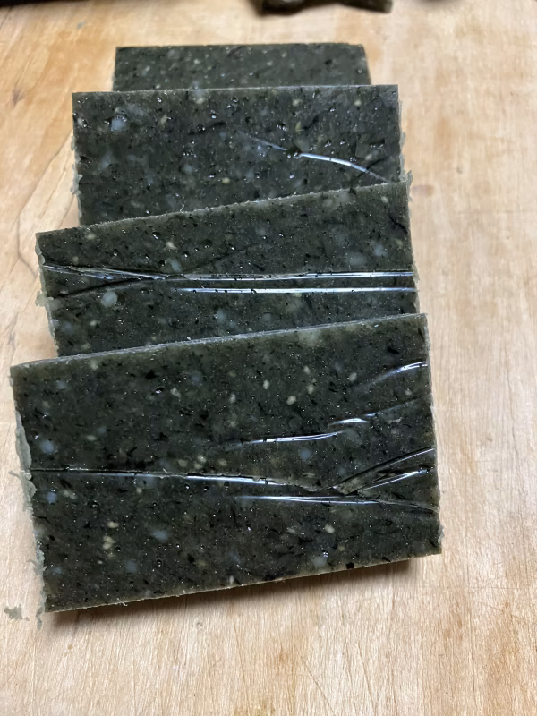 もち米の量を間違え通常よりヨモギが多くなってしまいました。また、ヨモギを入れるタイミングが合わず若干もち米の粒が残っていますが焼いていただきますと通常の餅同様柔らかくなめらかなお餅になります。