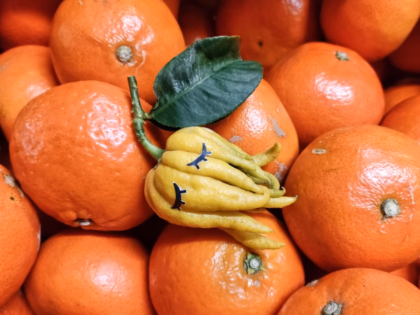仏手柑はお正月やお茶席で飾られる縁起の良い柑橘です。果肉がなく皮だけで、甘く豊かなよい香りがします。葉がある場合とない場合があります。