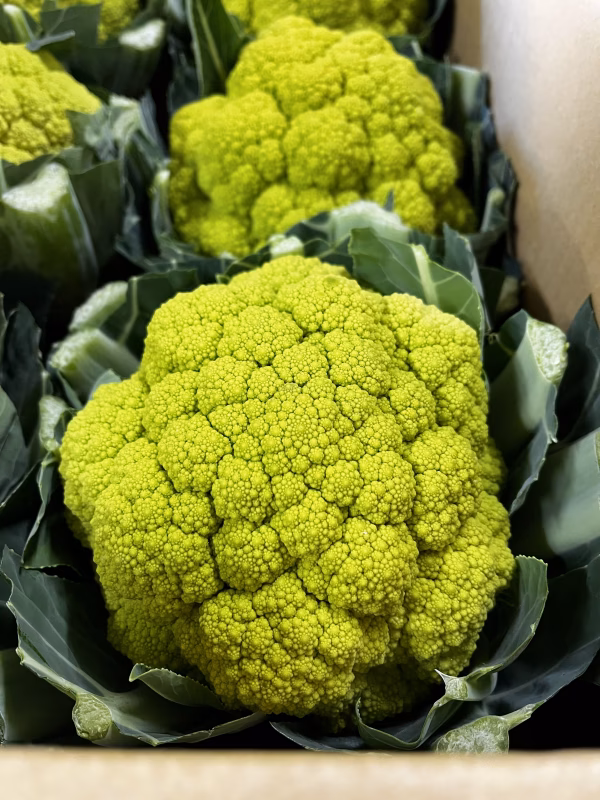 寒くなり甘みがあり、よく締まったエメラルドグリーンのカリフラワーです。あまりスーパーでは見かけず鮮やかな色合いが特徴です。色合いが料理を引き立てるので、軽く茹でて料理に添えたり、パスタと一緒によく茹でて、ニンニク、唐辛子、オリーヴ油と和えると、見た目も美しく美味しい一品に。ホワイトソースと色のコントラストを生かしたグラタンにも最適です。
