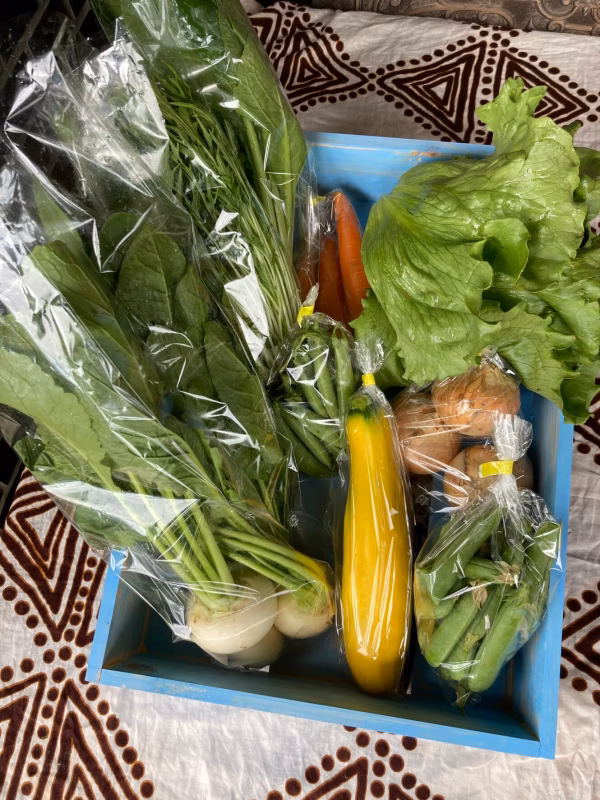 年間60品目を野菜ごとに旬に併合わせて露地で作ってます。基本的にセットの中身は人間の都合でなく、畑にあわせて9-10種類ほど葉物、根菜類をバランス良く入れさせて頂きます。