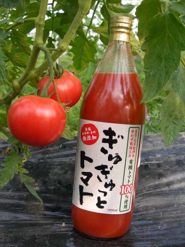 「ひとっちゃんの有機畑」の圃場はすべて有機JASの認定を受けています。その圃場でとれた有機トマトだけで出来たトマトジュースです。