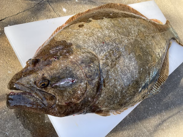 今朝の素潜り漁で海に潜り銛で突いたヒラメです。