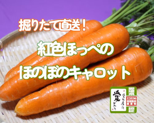 「ほのぼのキャロット」(人参) は、人参特有の臭みが少なく、みずみずしくて爽やかな甘みがあり、一般的な人参と比べて、抗酸化作用のあるβ‐カロテンを多く含む品種です。小さなお子様や人参が苦手な方にも美味しく召し上がっていただけます。