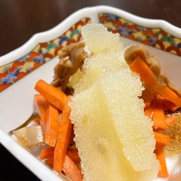 パリポリの数の子、とろ〜っとろの昆布、噛むほどに旨味が増すイカ、そこにコリコリの人参が入っています。病みつきになる美味しさです。
