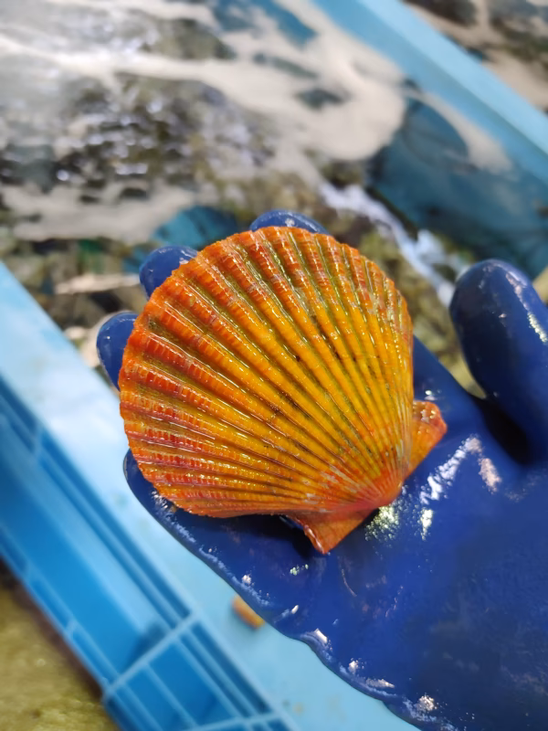 - 3年前、試験養殖を開始。肉厚で美味しいヒオウギ貝に育ったので、海外輸出を計画し生産量を増やしました。しかし、東京電力のよる処理水の海洋放出、中国の輸入停止を受け輸出を断念しました。5000枚のヒオウギ貝が行き場をなくしました。