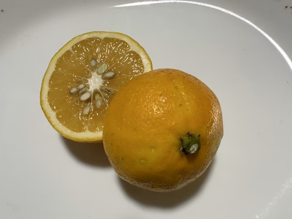 オレンジ系のレモンで、形は丸く、味はほんのり甘みがあり、果汁もたっぷりです。