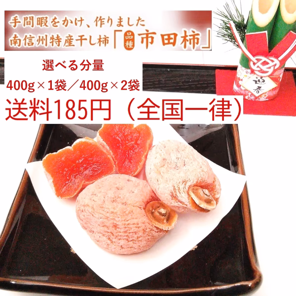 - 干し柿(自然乾燥品) 原材料名:柿(品種:市田柿 南信州松川町産)、酸化防止剤(二酸化硫黄)
