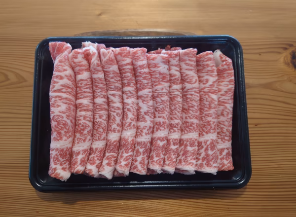自社牧場で長期肥育した黒毛和牛(経産牛)のスライスです。