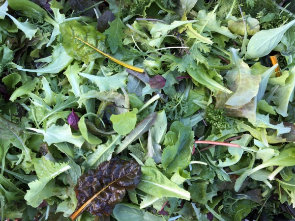 「ごみっくす」とは、定番のレタス数種類からはじまり、ルッコラやパセリなど香りの良いハーブ系、その他ほろ苦いもの、ピリ辛でアクセントになるもの、彩りのきれいなもの、その数多いときで30種類以上のサラダ専用野菜を五味農園のオリジナルブレンドで作り上げるサラダです。