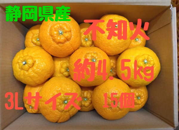 静岡県東伊豆のポンコツはじめ農園です。今回の出品は、不知火3Lサイズです、サイズは88ミリから95ミリ、それを何と15個。一般小売価格 1個 300円以上で、パック詰めで売られております。不知火はデコがあるのが特徴です、樹勢が良いとその傾向は増します、そして果実面の粗滑もボコボコとしたものが多く生産されます、今回そのようなボコボコとした果実も混じりますので、この大きさでこの価格はお買い得だと思います。是非この機会に、ご購入願います。めったに、出回らない商品です。