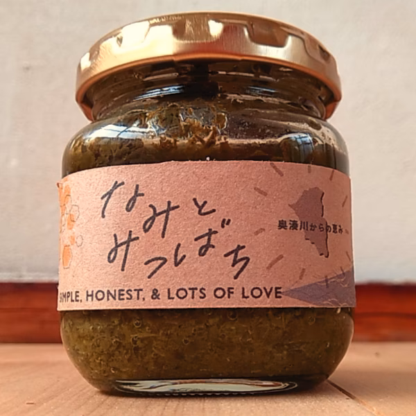 隠れた清流湊川のほとりで、田畑を耕しゆっくり暮らすなみとみつばちが、自家栽培のフレッシュバジルとにんにく、黒潮町が誇る天日塩を使って一つ一つ丁寧に作ったシンプルなバジルペーストです。