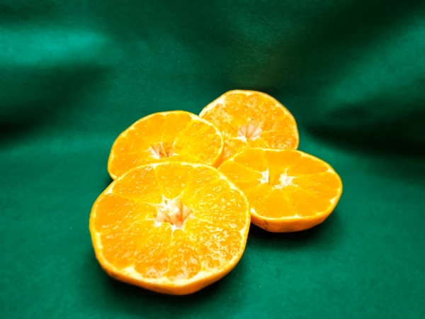 例年より、ほかの柑橘同様に着色が悪く、果肉先行の生育です。(簡単に説明しますと中身はできているけど見た目の色が遅い)色は赤みはすくなく、黄色からオレンジ色ですが、中身の果肉は画像の通り例年通りです。
