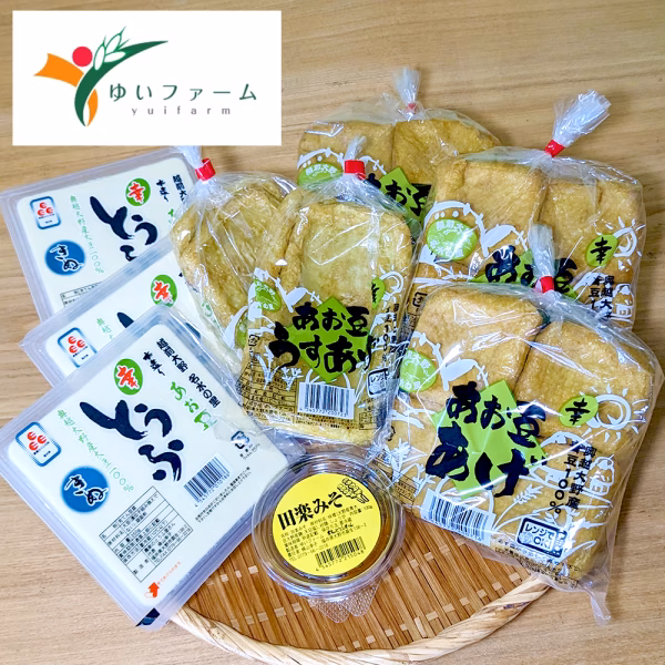 自家栽培の青大豆と、日本百名山荒島岳の伏流水を使用した豆腐と油揚げのセットです。