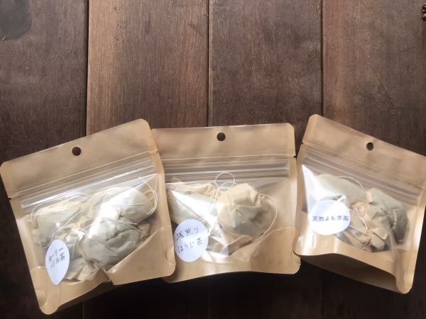 「天然よもぎ茶」は畑に生えてくる天然よもぎの若葉だけを丁寧に手摘みしてお茶にしています。想像以上に飲みやすく大人気です。