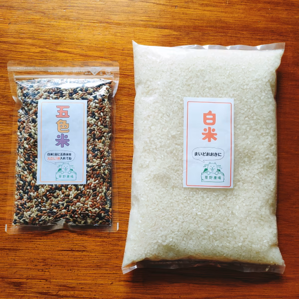 草野農場の五色米と白米のセットです。白米の量を1.5kg、3kg、4.5kgの中からお選びください。