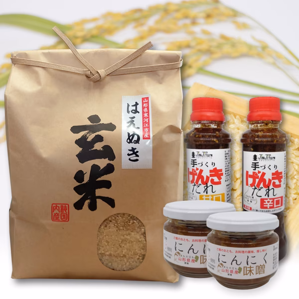 山形県産はえぬき玄米と、にんにく加工品のセットをお届けいたします。