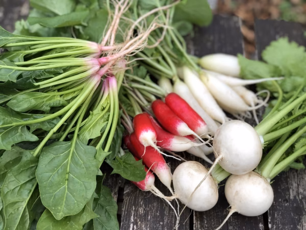 今回の商品内容は、現在五味農園で収穫可能なラディッシュやサラダかぶ、ミニ大根、白菜、ほうれん草などのおまかせ詰め合わせになります。