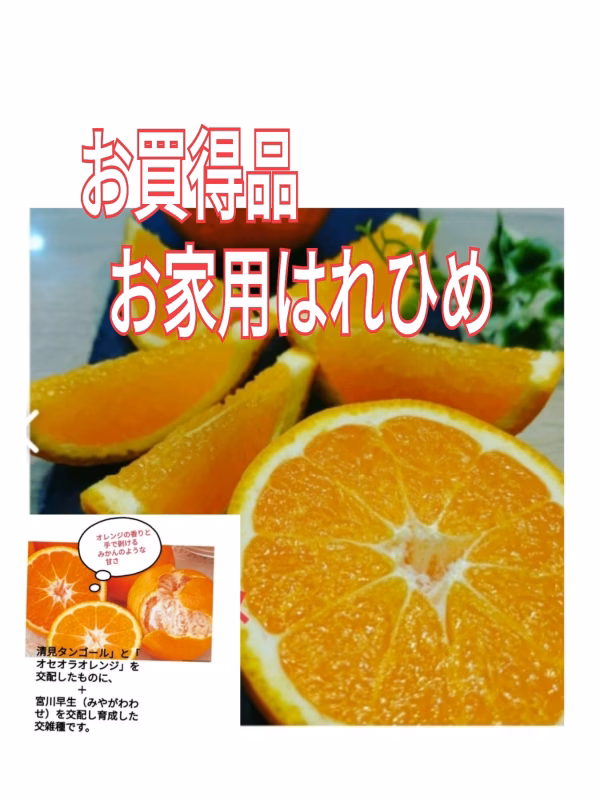和歌の気候が いい、有田郡有田川町で作られた、はれひめです。 2S〜2Lサイズまで入っています。 【はれひめ】は見た目はオレンジのようで、果皮が分厚く食べにくそうに見えますが、そんな事はありません!皮はみかんのように剥きやすく、一部分の皮を剥いてしまえば、そこからスルスルと剥く事が出来ます。 中の房も1つ1つが分離しやすく、みかんのように食べていただけます。 皮が薄くて甘いと評判のみかんです。😄 ※初め少し剥きにくい物もあります。 収穫したてなので、皮が硬い場合がある時は、 スマイルカットで食べてください。 皮に少し黒点がありますが、低農薬で安心して、 美味しく召し上がって頂けます。 ※種がある時もあります。 ちょっと訳あり 〇表面のスリ傷がはいります 〇少しの皮に茶色が入ります 〇皮にシワが入ります。 画像で参照ください 地元の方にも大人気な、お買得品家庭用です。 剥いてしまえば、美味しく召し上がれます。 ⚫神経質な方は秀品をご注文くださいませ 家庭用で食べる方におすすめします。 #有田みかん#みかん#美味しいみかん#フレッシュみかん#採れたて#冬の果物#贈り物#柑橘#旬の果物#木成り熟成#甘いみかん#越冬早生みかん#レア品#ハレヒメ#お家みかん#2023福袋 (以下、ポケットマルシェ事務局注記) この商品は「和歌山県紀中エリアの生産者の商品」です。