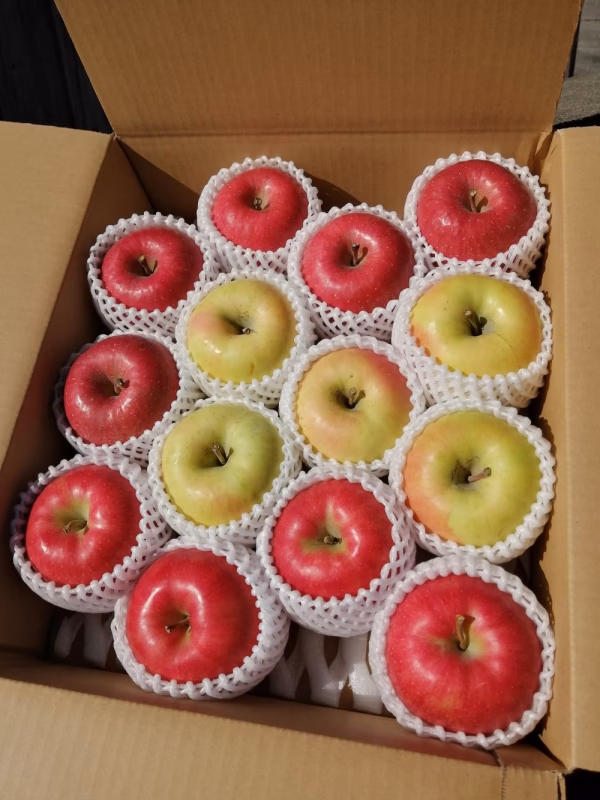 サンジョナゴールド(スマートフレッシュ処理済)、名月、サンふじの3種類、または単色などご要望通りに詰め合わせてのお届けとなります。