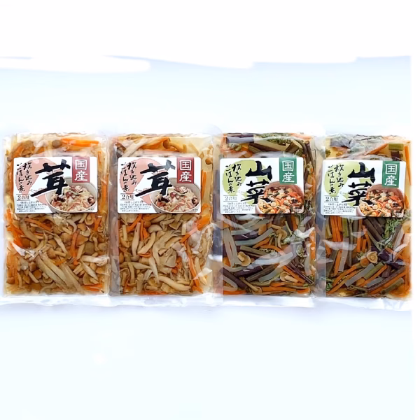 - <きのこごはんの素> ぶなしめじ・まいたけ・なめこ・人参・ごぼう・醤油・発酵調味液・食塩・アミノ酸・クエン酸(一部に大豆・小麦を含む) <山菜ごはんの素> わらび・なめこ・こんにゃく・人参・醤油・発酵調味液・アミノ酸・クエン酸(一部に大豆・小麦を含む)