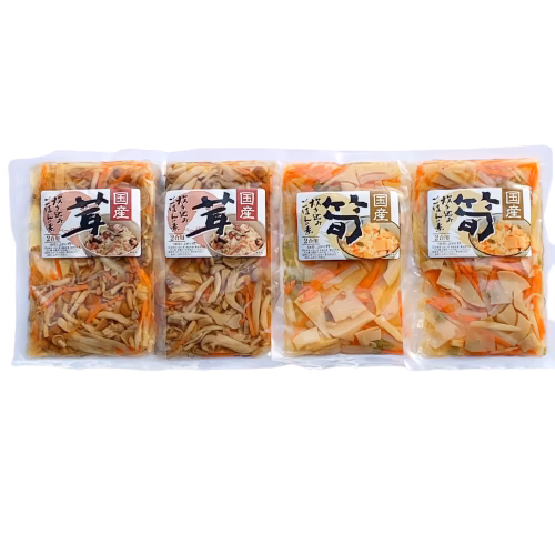 - <たけのこごはんの素> 孟宗竹・こんにゃく・人参・ごぼう・みず・醤油・食塩・アミノ酸・発酵調味液・クエン酸(一部に大豆・小麦を含む) <きのこごはんの素> ぶなしめじ・まいたけ・なめこ・人参・ごぼう・醤油・発酵調味液・食塩・アミノ酸・クエン酸(一部に大豆・小麦を含む)