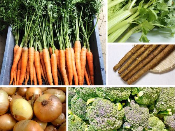 にがくてあまいの第1話に登場する「野菜と雑穀のスープ」の材料である、ごぼう、玉ねぎ、にんじん、ブロッコリー、セロリを詰合せて出荷いたします。