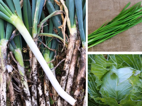 にがくてあまいの第4話に登場する「油あげ入り野菜餃子」の材料である、キャベツ、にら、白ネギを詰合せて出荷いたします。
