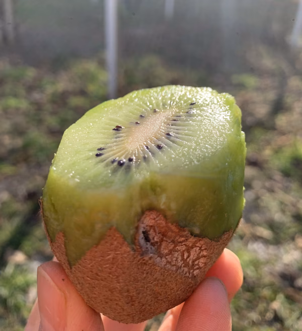 当園では、11月中旬から約2週間でキウイを収穫し、冷暗所で保管しております。 収穫後、日が経つにつれ、少しずつキウイから水分が抜け、シワが入ってきます。 (このシワ入りキウイがまた、一段と濃厚で美味しいのです。)