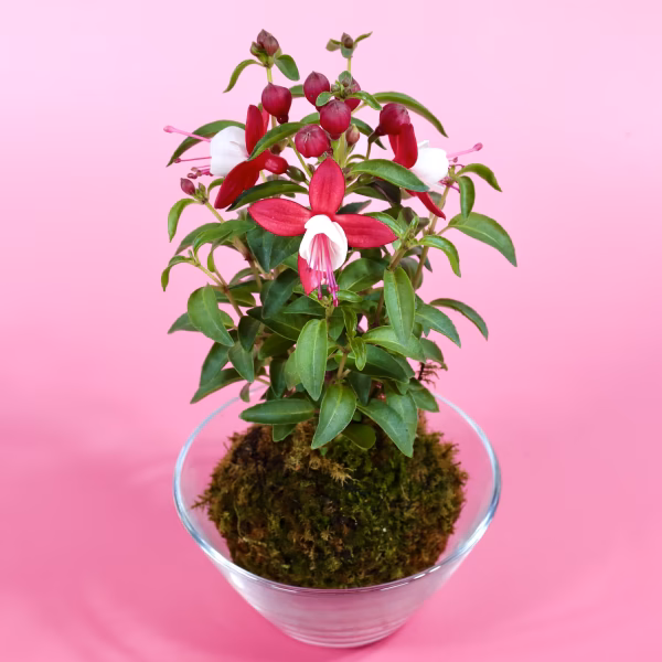 別名「貴婦人のイヤリング」と呼ばれるフクシアと、高野山麓で採取しまし這苔を使った苔玉です。